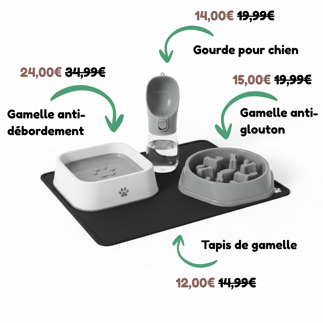 Fini les corvées de nettoyage et les inquiétudes pour sa santé. Tout ce dont votre chien a besoin pour être heureux et en bonne santé, réuni dans un seul pack complet.